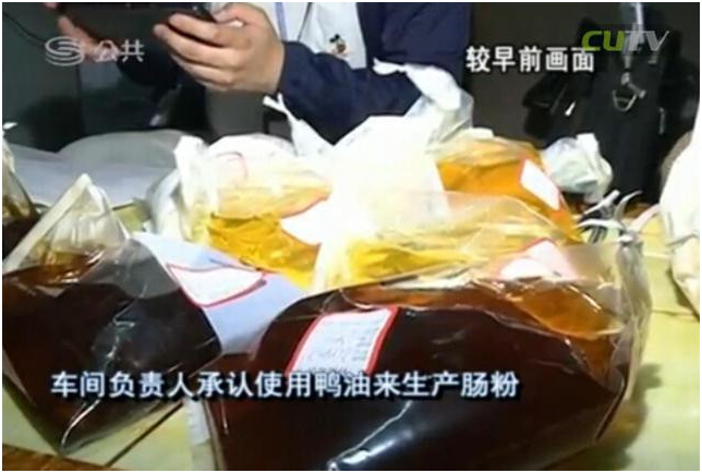 在執(zhí)法人員查獲6桶來歷不明的油之后,車間負(fù)責(zé)人承認(rèn)使用鴨油來生產(chǎn)腸粉?!斑@是什么油?”“是鴨油?!薄翱绝喪O碌哪欠N?”“對(duì)?!?