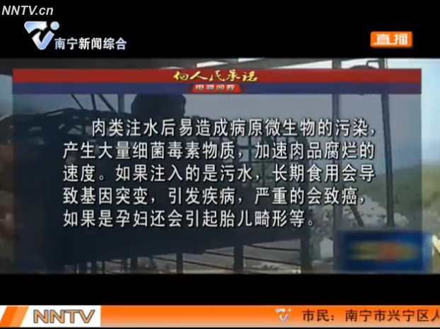 南寧市食品藥品監(jiān)督管理局局長(zhǎng)黃明瑞回應(yīng):對(duì)于注水肉的問題,我們從改革以來就一直堅(jiān)持打擊,特別是今年夏季針對(duì)肉類食品進(jìn)行了大規(guī)模的整治行動(dòng),發(fā)現(xiàn)問題后馬上進(jìn)行懲處。首先我們要從源頭上杜絕注水肉,第二,肉類在進(jìn)入市場(chǎng)要進(jìn)行檢驗(yàn)檢測(cè),合格以后才能上市銷售,市場(chǎng)開放方要建立查驗(yàn)查證制度,作為監(jiān)管部門要加大巡查力度,發(fā)現(xiàn)有違法添加的要立案進(jìn)行查處。